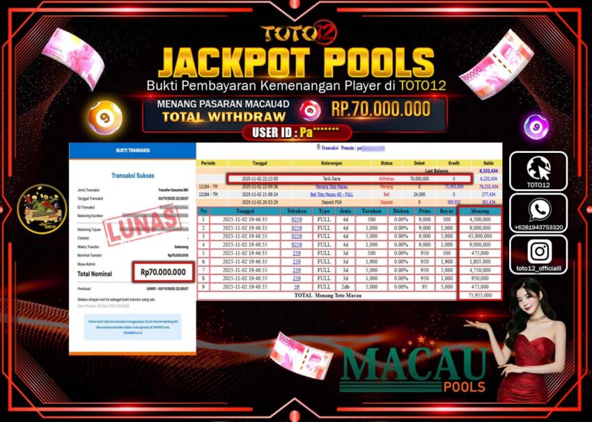 Selamat kepada Member Kami Pa****** Telah Jackpot dan berhasil mendapatkan kemenangan besar pada permainan JACKPOT POOLS PASARAN (MACAU 4D) Dengan Kemenangan Sebesar Rp.70.000.000 –. Setelah mengisi Fomulir Withdraw dengan Kurang waktu 1-2 Menit Dana sudah kami Trasnfer kepada Pemilik Userid dan dana sudah dapat di cairkan oleh pemenang. Bukti Pembayaran yang TOTO12 berikan merupakan Bukti Pembayaran yang SAH / VALID yang langsung Di dapatkan melalui transaksi dari Bank yang di Tunju.