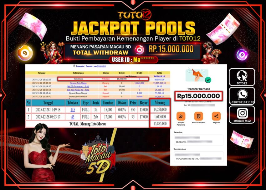 Selamat kepada Member Kami Ma****** Telah Jackpot dan berhasil mendapatkan kemenangan besar pada permainan JACKPOT POOLS PASARAN (MACAU 5D) Dengan Kemenangan Sebesar Rp.15.000.000 –.