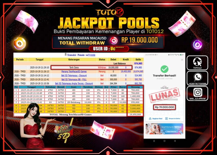 Selamat kepada Member Kami Uc****** Telah Jackpot dan berhasil mendapatkan kemenangan besar pada permainan JACKPOT POOLS PASARAN (MACAU 5D) Dengan Kemenangan Sebesar Rp.19.000.000 –. Setelah mengisi Fomulir Withdraw dengan Kurang waktu 1-2 Menit Dana sudah kami Trasnfer kepada Pemilik Userid dan dana sudah dapat di cairkan oleh pemenang. Bukti Pembayaran yang TOTO12 berikan merupakan Bukti Pembayaran yang SAH / VALID yang langsung Di dapatkan melalui transaksi dari Bank yang di Tunju.