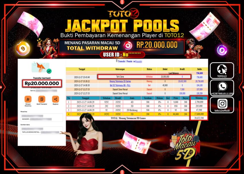 Selamat kepada Member Kami No****** Telah Jackpot dan berhasil mendapatkan kemenangan besar pada permainan JACKPOT POOLS PASARAN (MACAU 5D) Dengan Kemenangan Sebesar Rp.20.000.000 –.