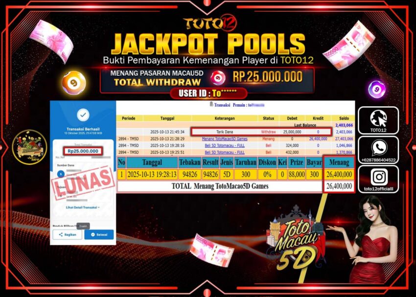 Selamat kepada Member Kami To****** Telah Jackpot dan berhasil mendapatkan kemenangan besar pada permainan JACKPOT POOLS PASARAN (MACAU 5D)  Dengan Kemenangan Sebesar Rp.25.000.000 –.  Setelah mengisi Fomulir Withdraw dengan Kurang waktu 1-2 Menit Dana sudah kami Trasnfer kepada Pemilik Userid dan dana sudah dapat di cairkan oleh pemenang. Bukti Pembayaran yang TOTO12 berikan merupakan Bukti Pembayaran yang  SAH / VALID yang langsung Di dapatkan melalui transaksi dari Bank yang di Tunju.