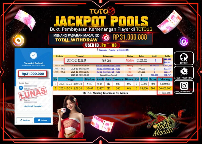 HANYA DI TOTO12 JP PASTI DI BAYAR LUNAS DAN CEPAT!!!!!! JACKPOT POOLS PASARAN (MACAU 5D) Rp.31.000.000 !!!!