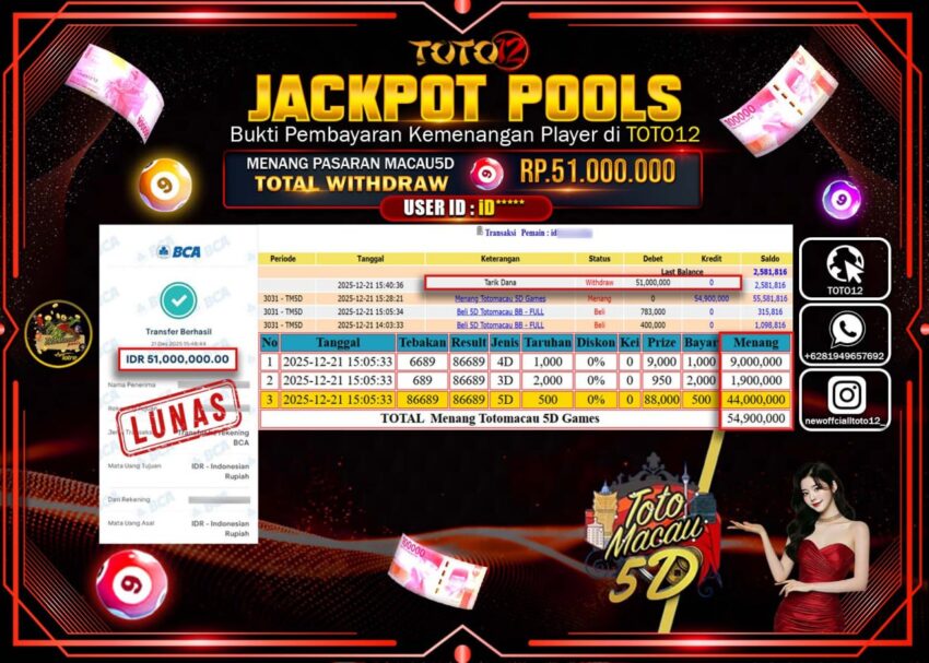 HANYA DI TOTO12 JP PASTI DI BAYAR LUNAS DAN CEPAT!!!!!! JACKPOT POOLS PASARAN (MACAU 5D) Rp.51.000.000 !!!!