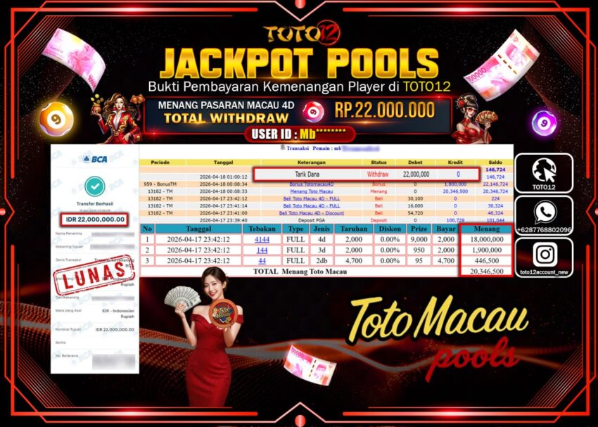 HANYA DI TOTO12 JP PASTI DI BAYAR LUNAS DAN CEPAT!!!!!! JACKPOT POOLS PASARAN (MACAU4D) Rp.22.000.000!!!!