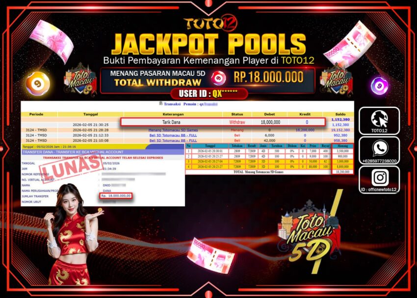 Selamat kepada Member Kami Qx****** Telah Jackpot dan berhasil mendapatkan kemenangan besar pada permainan JACKPOT POOLS PASARAN (MACAU5D) Dengan Kemenangan Sebesar Rp.18.000.000 –.