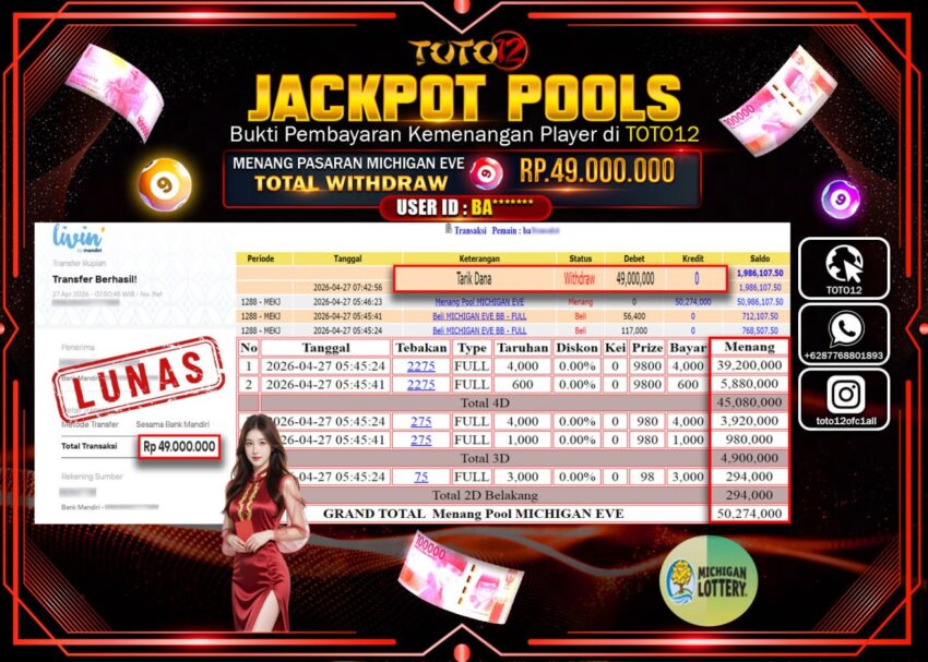 Selamat kepada Member Kami Ba****** Telah Jackpot dan berhasil mendapatkan kemenangan besar pada permainan JACKPOT POOLS PASARAN ( MICHIGAN EVE ) Dengan Kemenangan Sebesar Rp.49.000.000–.