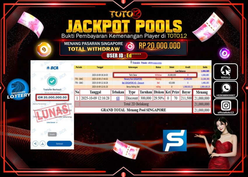 Selamat kepada Member Kami Ed****** Telah Jackpot dan berhasil mendapatkan kemenangan besar pada permainan JACKPOT POOLS PASARAN (SINGAPORE) Dengan Kemenangan Sebesar Rp.20.000.000 –. Setelah mengisi Fomulir Withdraw dengan Kurang waktu 1-2 Menit Dana sudah kami Trasnfer kepada Pemilik Userid dan dana sudah dapat di cairkan oleh pemenang. Bukti Pembayaran yang TOTO12 berikan merupakan Bukti Pembayaran yang SAH / VALID yang langsung Di dapatkan melalui transaksi dari Bank yang di Tunju.