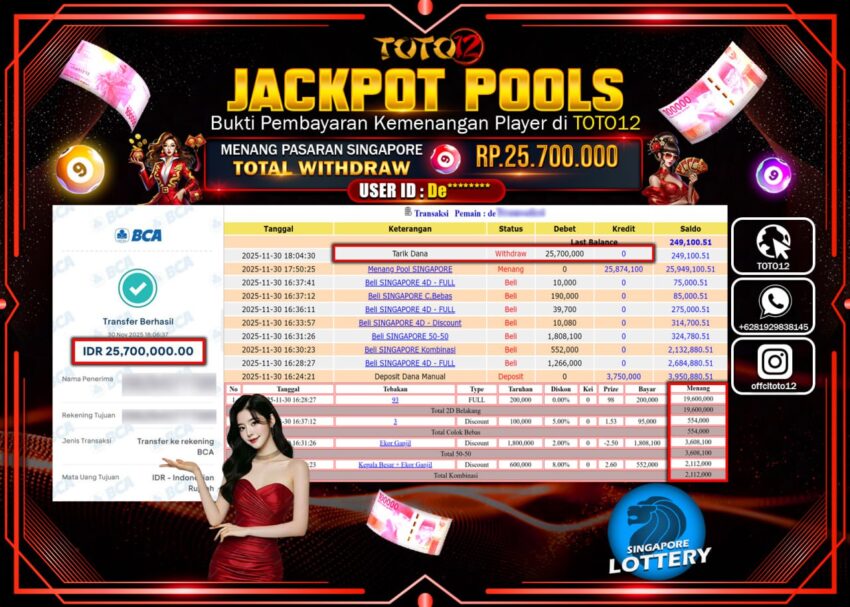 Selamat kepada Member Kami De****** Telah Jackpot dan berhasil mendapatkan kemenangan besar pada permainan JACKPOT POOLS PASARAN (SINGAPORE) Dengan Kemenangan Sebesar Rp.25.700.000 –.