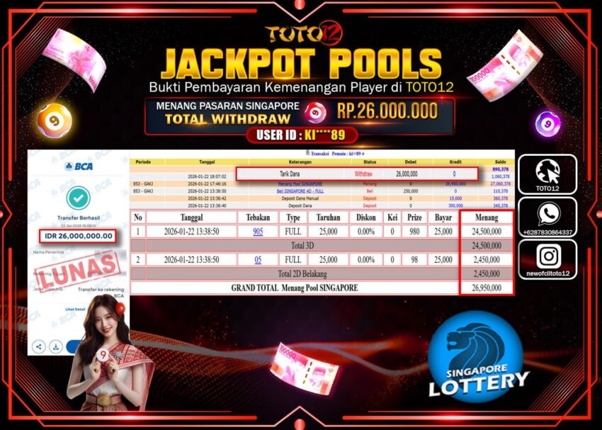 Selamat kepada Member Kami Ki****** Telah Jackpot dan berhasil mendapatkan kemenangan besar pada permainan JACKPOT POOLS PASARAN (SINGAPORE) Dengan Kemenangan Sebesar Rp.26.000.000 –.