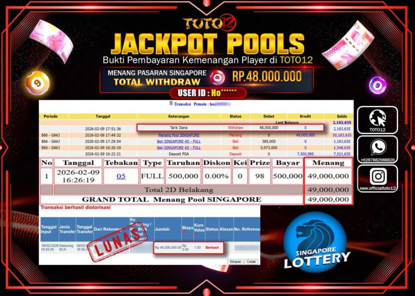 Selamat kepada Member Kami Ho***** Telah Jackpot dan berhasil mendapatkan kemenangan besar pada permainan JACKPOT POOLS PASARAN (SINGAPORE) Dengan Kemenangan Sebesar Rp.48.000.000–.
