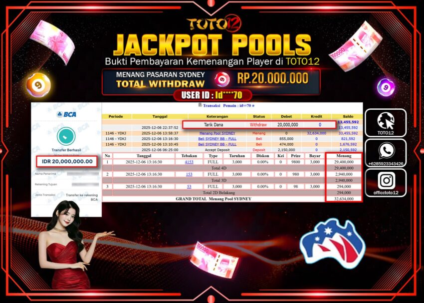 Selamat kepada Member Kami Id****** Telah Jackpot dan berhasil mendapatkan kemenangan besar pada permainan JACKPOT POOLS PASARAN (SYDNEY) Dengan Kemenangan Sebesar Rp.20.000.000 –.