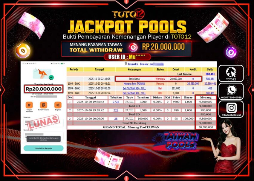 Selamat kepada Member Kami Mu****** Telah Jackpot dan berhasil mendapatkan kemenangan besar pada permainan JACKPOT POOLS PASARAN (TAIWAN)  Dengan Kemenangan Sebesar Rp.20.000.000 –.  Setelah mengisi Fomulir Withdraw dengan Kurang waktu 1-2 Menit Dana sudah kami Trasnfer kepada Pemilik Userid dan dana sudah dapat di cairkan oleh pemenang. Bukti Pembayaran yang TOTO12 berikan merupakan Bukti Pembayaran yang  SAH / VALID yang langsung Di dapatkan melalui transaksi dari Bank yang di Tunju.