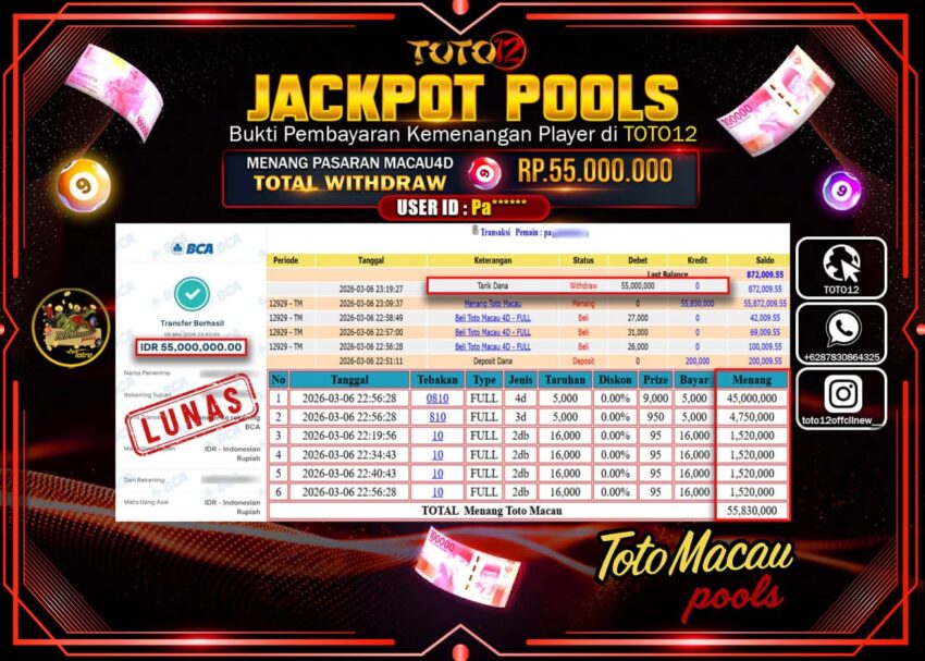 Selamat kepada Member Kami Pa****** Telah Jackpot dan berhasil mendapatkan kemenangan besar pada permainan JACKPOT POOLS PASARAN (TOTOMACAU 4D) Dengan Kemenangan Sebesar Rp.55.000.000–.