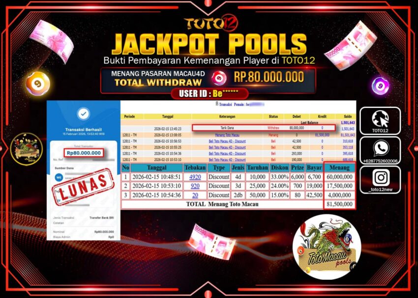 Selamat kepada Member Kami Be****** Telah Jackpot dan berhasil mendapatkan kemenangan besar pada permainan JACKPOT POOLS PASARAN (TOTOMACAU 4D) Dengan Kemenangan Sebesar Rp.80.000.000–.