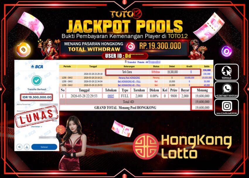 Selamat kepada Member Kami Dd****** Telah Jackpot dan berhasil mendapatkan kemenangan besar pada permainan JACKPOT POOLS PASARAN(HONGKONG) Dengan Kemenangan Sebesar Rp.19.300.000–.