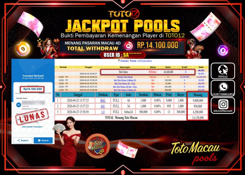 Selamat kepada Member Kami SA****** Telah Jackpot dan berhasil mendapatkan kemenangan besar pada permainan JACKPOT POOLS PASARAN (MACAU 4D) Dengan Kemenangan Sebesar Rp.14.100.000–.