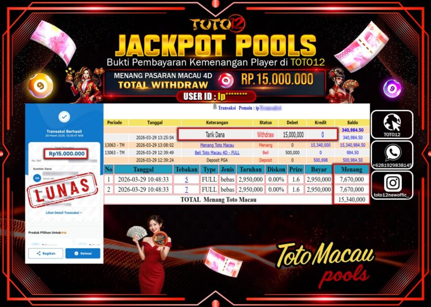 Selamat kepada Member Kami lp****** Telah Jackpot dan berhasil mendapatkan kemenangan besar pada permainan JACKPOT POOLS PASARAN (MACAU 4D) Dengan Kemenangan Sebesar Rp.15.000.000–.