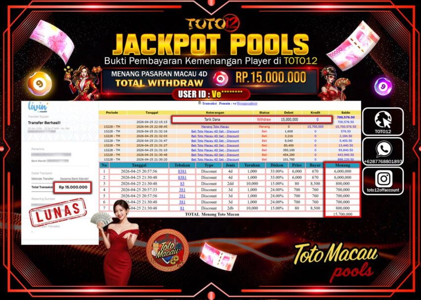 Selamat kepada Member Kami Ve****** Telah Jackpot dan berhasil mendapatkan kemenangan besar pada permainan JACKPOT POOLS PASARAN (MACAU 4D)  Dengan Kemenangan Sebesar Rp.15.000.000–.