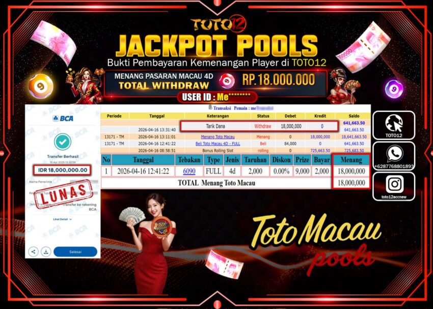 Selamat kepada Member Kami Me****** Telah Jackpot dan berhasil mendapatkan kemenangan besar pada permainan JACKPOT POOLS PASARAN (MACAU 4D)  Dengan Kemenangan Sebesar Rp.18.000.000–.
