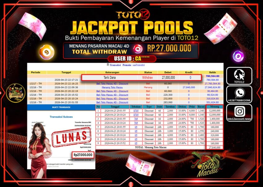 Selamat kepada Member Kami CA****** Telah Jackpot dan berhasil mendapatkan kemenangan besar pada permainan JACKPOT POOLS PASARAN (MACAU 4D) Dengan Kemenangan Sebesar Rp.27.000.000–.