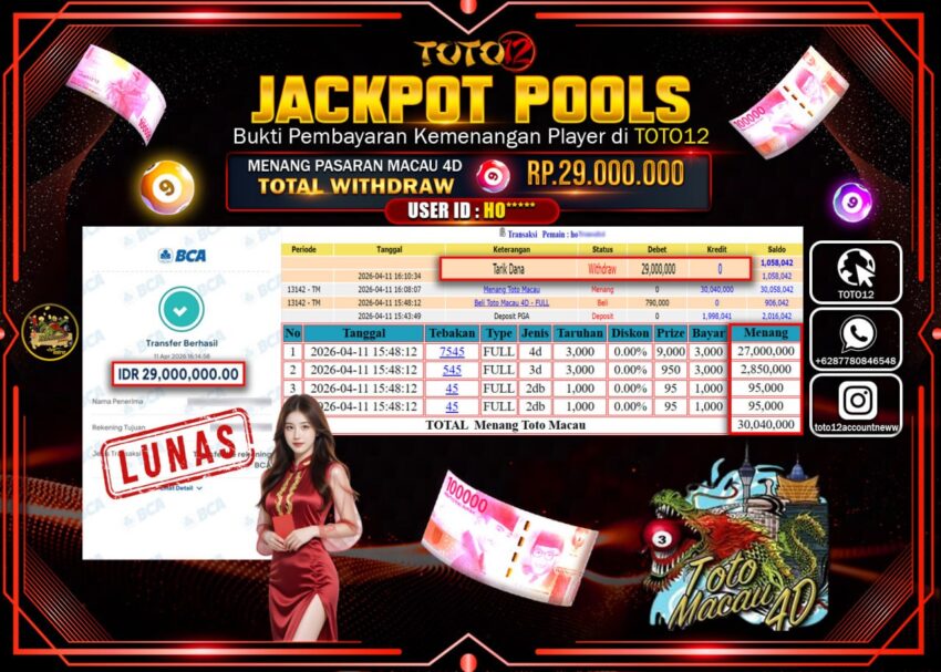 Selamat kepada Member Kami HO****** Telah Jackpot dan berhasil mendapatkan kemenangan besar pada permainan JACKPOT POOLS PASARAN (MACAU 4D) Dengan Kemenangan Sebesar Rp.29.000.000–.