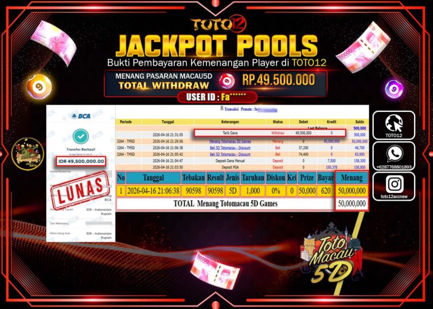 Selamat kepada Member Kami Fa****** Telah Jackpot dan berhasil mendapatkan kemenangan besar pada permainan JACKPOT POOLS PASARAN (MACAU 5D) Dengan Kemenangan Sebesar Rp.49.500.000–.