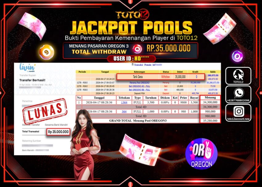 Selamat kepada Member Kami HD****** Telah Jackpot dan berhasil mendapatkan kemenangan besar pada permainan JACKPOT POOLS PASARAN (OREGON 3) Dengan Kemenangan Sebesar Rp.35.000.000–.
