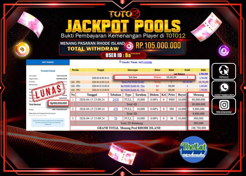 Selamat kepada Member Kami Ba****** Telah Jackpot dan berhasil mendapatkan kemenangan besar pada permainan JACKPOT POOLS PASARAN (RHODE ISLAND)  Dengan Kemenangan Sebesar Rp.105.000.000–.
