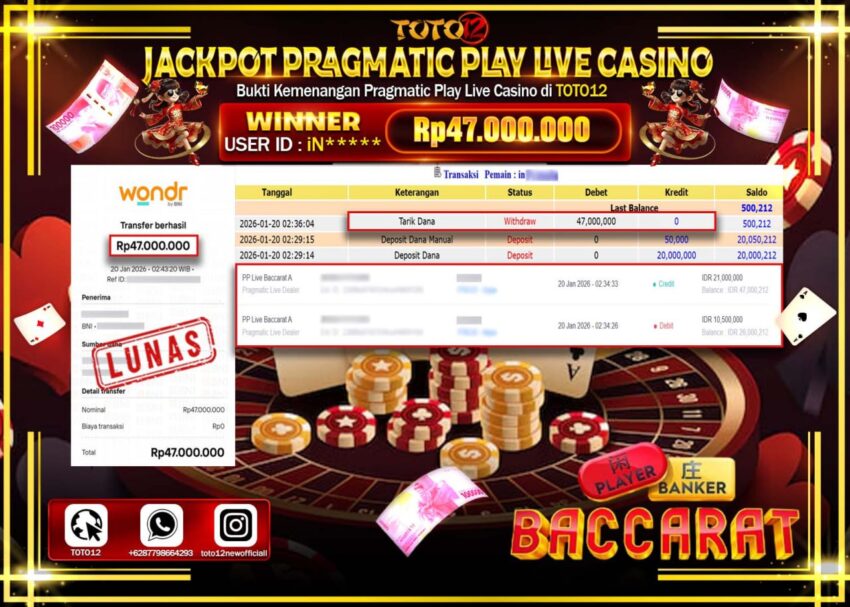 HANYA DI TOTO12 JP PASTI DI BAYAR LUNAS DAN CEPAT!!!!!! JACKPOT PRAGMATIC PLAY LIVE CASINO (BACCARAT A) Rp.47.000.000 !!!!