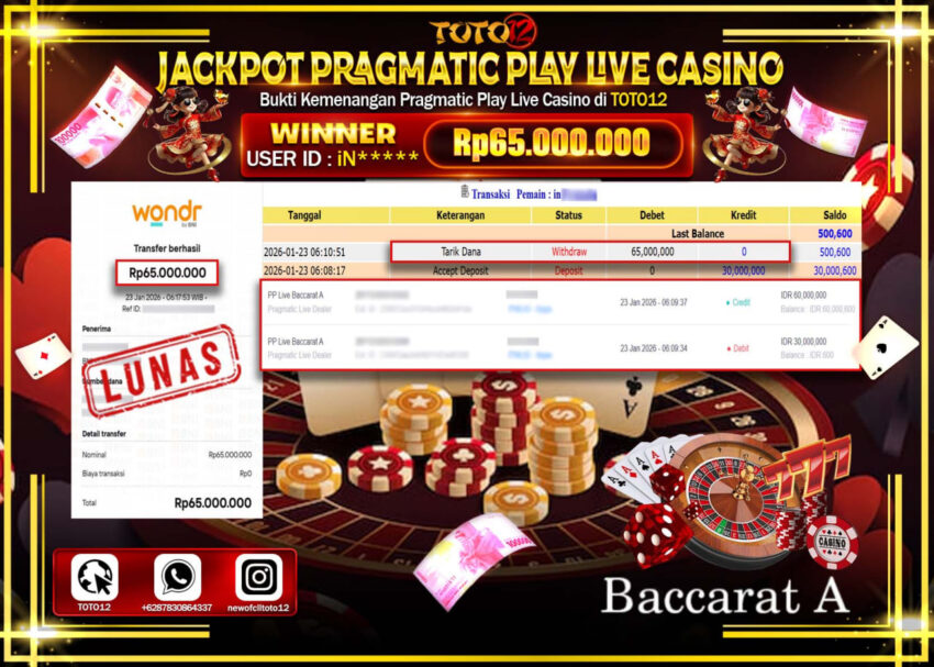 Selamat kepada Member Kami Ma****** Telah Jackpot dan berhasil mendapatkan kemenangan besar pada permainan JACKPOT PRAGMATIC PLAY LIVE CASINO (BACCARAT A) Dengan Kemenangan Sebesar Rp.65.000.000 –.