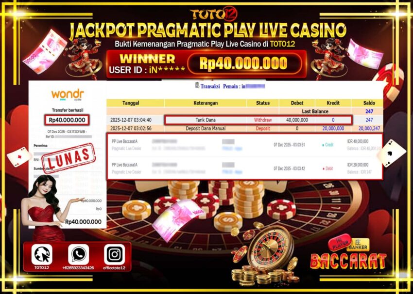 Selamat kepada Member Kami In****** Telah Jackpot dan berhasil mendapatkan kemenangan besar pada permainan JACKPOT PRAGMATIC PLAY LIVE CASINO (LIVE BACCARAT) Dengan Kemenangan Sebesar Rp.40.000.000 –.