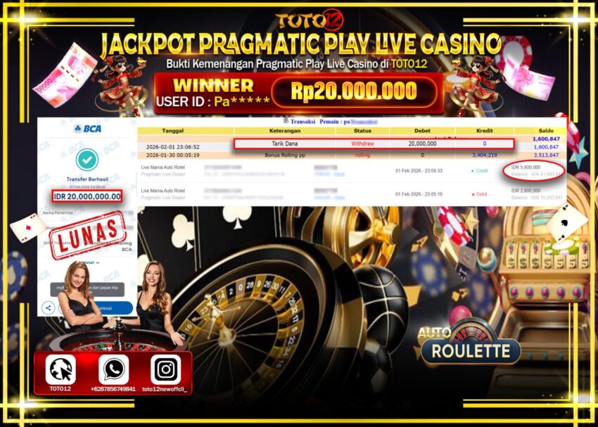 Selamat kepada Member Kami Pa****** Telah Jackpot dan berhasil mendapatkan kemenangan besar pada permainan JACKPOT PRAGMATIC PLAY LIVE CASINO (MANIA AUTO ROLET) Dengan Kemenangan Sebesar Rp.60.000.000 –.