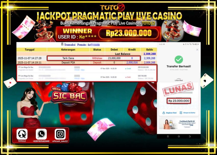 Selamat kepada Member Kami Ke****** Telah Jackpot dan berhasil mendapatkan kemenangan besar pada permainan JACKPOT PRAGMATIC PLAY LIVE CASINO (MEGA SIC BAC)  Dengan Kemenangan Sebesar Rp.23.000.000 –.  Setelah mengisi Fomulir Withdraw dengan Kurang waktu 1-2 Menit Dana sudah kami Trasnfer kepada Pemilik Userid dan dana sudah dapat di cairkan oleh pemenang. Bukti Pembayaran yang TOTO12 berikan merupakan Bukti Pembayaran yang  SAH / VALID yang langsung Di dapatkan melalui transaksi dari Bank yang di Tunju.