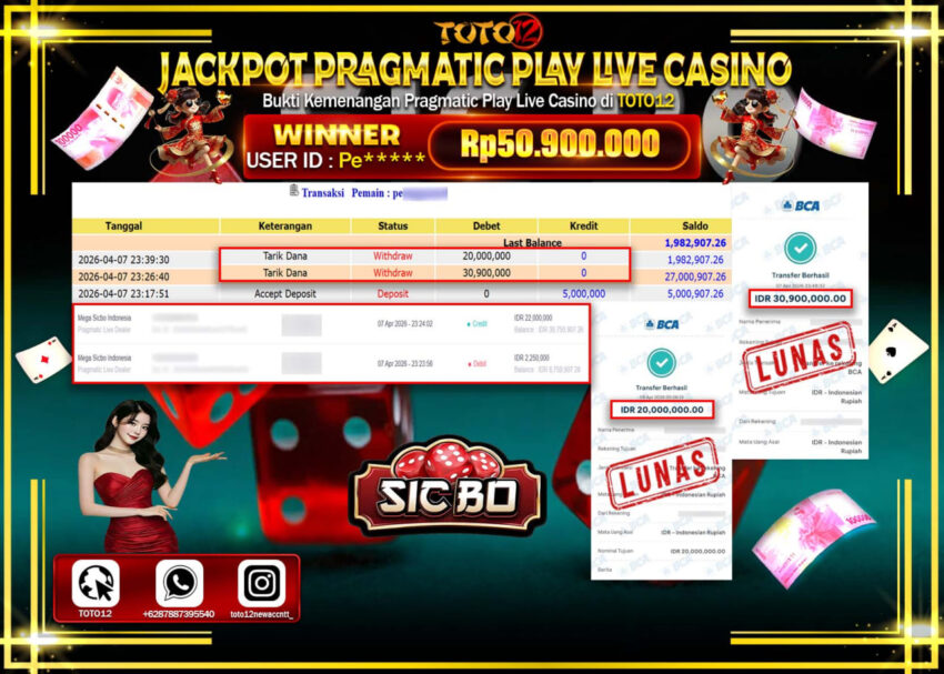 HANYA DI TOTO12 JP PASTI DI BAYAR LUNAS DAN CEPAT!!!!!! JACKPOT PRAGMATIC PLAY LIVE CASINO (MEGA SICBO) Rp.50.900.000!!!!
