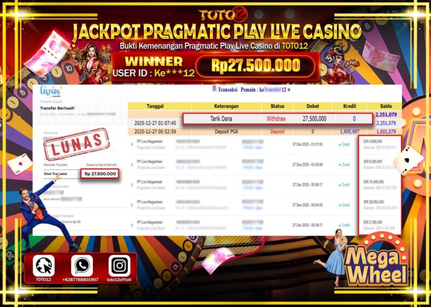 Selamat kepada Member Kami Ke****** Telah Jackpot dan berhasil mendapatkan kemenangan besar pada permainan JACKPOT PRAGMATIC PLAY LIVE CASINO (MEGA WHEEL)  Dengan Kemenangan Sebesar Rp.27.500.000 –.