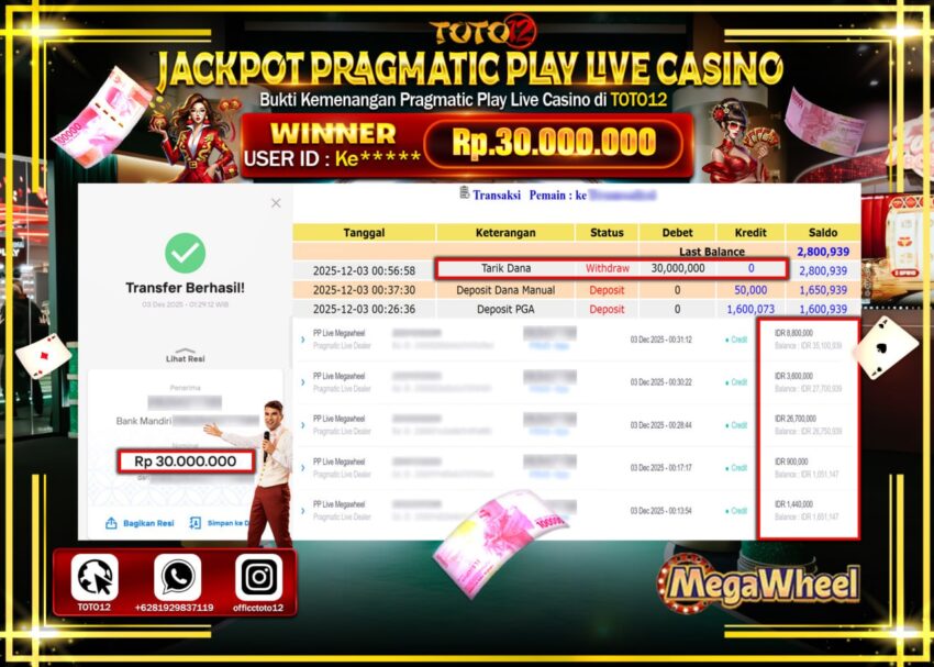 Selamat kepada Member Kami Ke****** Telah Jackpot dan berhasil mendapatkan kemenangan besar pada permainan JACKPOT PRAGMATIC PLAY LIVE CASINO (MEGA WHEEL) Dengan Kemenangan Sebesar Rp.30.000.000 –.