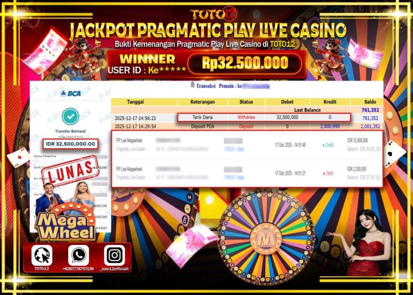 Selamat kepada Member Kami Ke****** Telah Jackpot dan berhasil mendapatkan kemenangan besar pada permainan JACKPOT PRAGMATIC PLAY LIVE CASINO (MEGA WHEEL) Dengan Kemenangan Sebesar Rp.32.500.000 –.