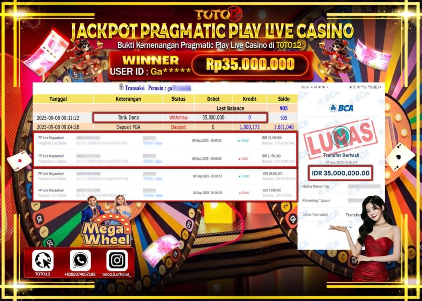 Selamat kepada Member Kami Ga****** Telah Jackpot dan berhasil mendapatkan kemenangan besar pada permainan JACKPOT PRAGMATIC PLAY LIVE CASINO (MEGA WHEEL) Dengan Kemenangan Sebesar Rp.35.000.000 –. Setelah mengisi Fomulir Withdraw dengan Kurang waktu 1-2 Menit Dana sudah kami Trasnfer kepada Pemilik Userid dan dana sudah dapat di cairkan oleh pemenang. Bukti Pembayaran yang TOTO12 berikan merupakan Bukti Pembayaran yang SAH / VALID yang langsung Di dapatkan melalui transaksi dari Bank yang di Tunju.