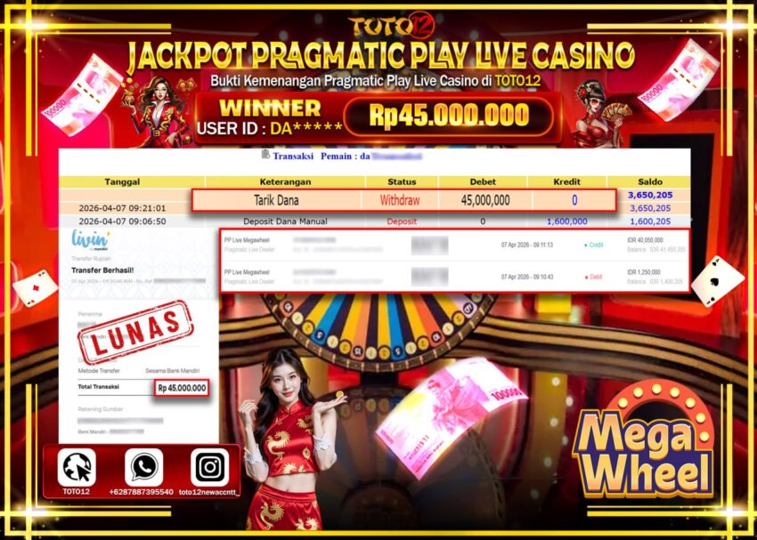 HANYA DI TOTO12 JP PASTI DI BAYAR LUNAS DAN CEPAT!!!!!! JACKPOT PRAGMATIC PLAY LIVE CASINO (MEGA WHEEL) Rp.45.000.000!!!!
