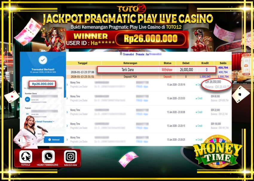 Selamat kepada Member Kami Ha****** Telah Jackpot dan berhasil mendapatkan kemenangan besar pada permainan JACKPOT PRAGMATIC PLAY LIVE CASINO (MONEY TIME) Dengan Kemenangan Sebesar Rp.26.000.000 –.