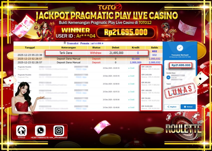 Selamat kepada Member Kami Ar****** Telah Jackpot dan berhasil mendapatkan kemenangan besar pada permainan JACKPOT PRAGMATIC PLAY LIVE CASINO (ROULETTE) Dengan Kemenangan Sebesar Rp.21.695.000 –.