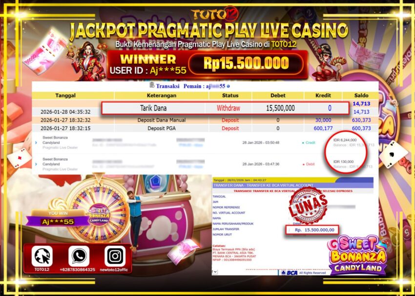 HANYA DI TOTO12 JP PASTI DI BAYAR LUNAS DAN CEPAT!!!!!! JACKPOT PRAGMATIC PLAY LIVE CASINO (SWEET BONANZA CANDY LAND) Rp.15.500.000 !!!!