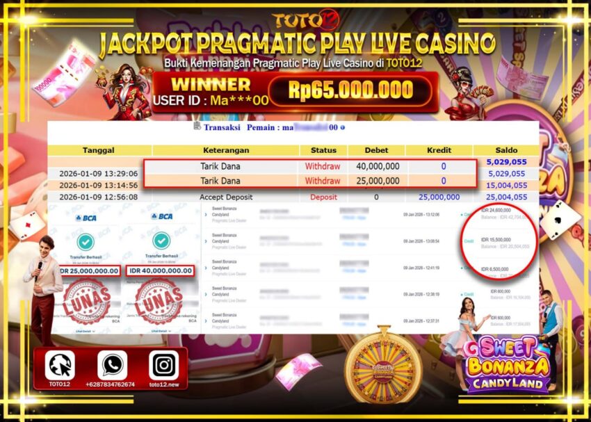 Selamat kepada Member Kami Ma****** Telah Jackpot dan berhasil mendapatkan kemenangan besar pada permainan JACKPOT PRAGMATIC PLAY LIVE CASINO (SWEET BONANZA CANDY LAND) Dengan Kemenangan Sebesar Rp.65.000.000 –.