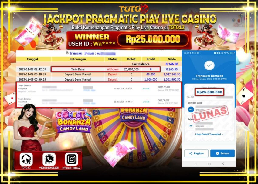 Selamat kepada Member Kami Wa****** Telah Jackpot dan berhasil mendapatkan kemenangan besar pada permainan JACKPOT PRAGMATIC PLAY LIVE CASINO (SWEET BONANZA CANDYLAND) Dengan Kemenangan Sebesar Rp.25.000.000 –. Setelah mengisi Fomulir Withdraw dengan Kurang waktu 1-2 Menit Dana sudah kami Trasnfer kepada Pemilik Userid dan dana sudah dapat di cairkan oleh pemenang. Bukti Pembayaran yang TOTO12 berikan merupakan Bukti Pembayaran yang SAH / VALID yang langsung Di dapatkan melalui transaksi dari Bank yang di Tunju.