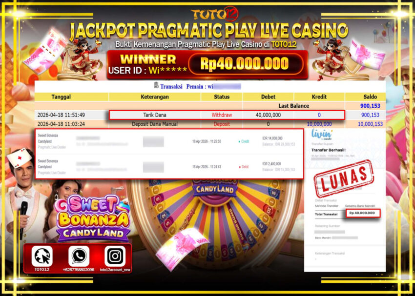 HANYA DI TOTO12 JP PASTI DI BAYAR LUNAS DAN CEPAT!!!!!! JACKPOT PRAGMATIC PLAY LIVE CASINO (SWEET BONANZA CANDYLAND) Rp.40.000.000!!!!