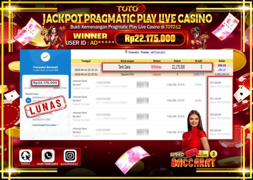 Selamat kepada Member Kami AD******  Telah Jackpot dan berhasil mendapatkan kemenangan besar pada permainan JACKPOT PRAGMATIC PLAY LIVE GAME CASINO (INDONESIA SPEED BACCARAT 2)  Dengan Kemenangan Sebesar Rp.22.175.000–.
