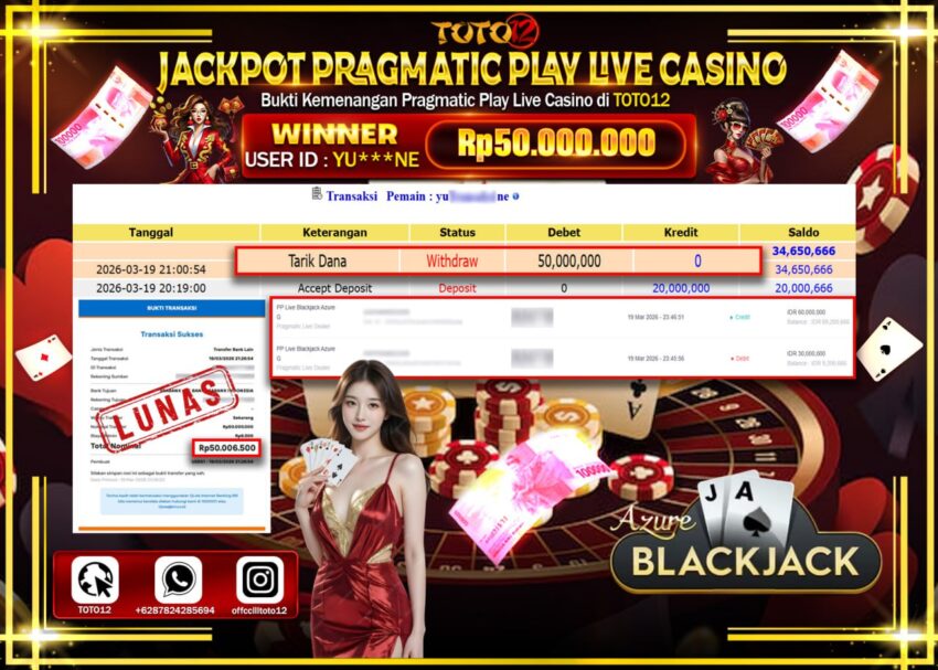 Selamat kepada Member Kami Yu*****NE Telah Jackpot dan berhasil mendapatkan kemenangan besar pada permainan JACKPOT PRAGMATIC PLAY LIVE GAME CASINO (PP LIVE BLACKJACK AZURE G) Dengan Kemenangan Sebesar Rp.50.000.000–. Setelah mengisi Fomulir Withdraw dengan Kurang waktu 1-2 Menit Dana sudah kami Trasnfer kepada Pemilik Userid dan dana sudah 75.000.000di cairkan oleh pemenang. Bukti Pembayaran yang TOTO12 berikan merupakan Bukti Pembayaran yang SAH / VALID yang langsung Di dapatkan melalui transaksi dari Bank yang di Tunju.