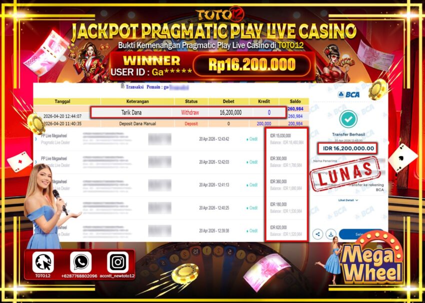 Selamat kepada Member Kami Ga****** Telah Jackpot dan berhasil mendapatkan kemenangan besar pada permainan JACKPOT PRAGMATIC PLAY LIVE GAME CASINO (PP LIVE MEGA WHEEL) Dengan Kemenangan Sebesar Rp.16.200.000–.
