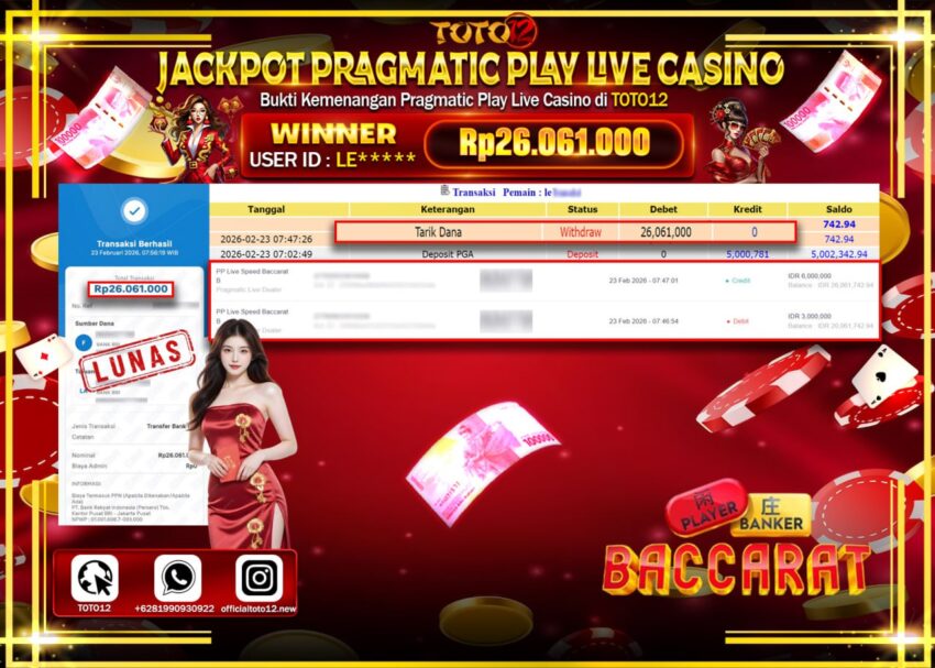 Selamat kepada Member Kami LE****  Telah Jackpot dan berhasil mendapatkan kemenangan besar pada permainan JACKPOT PRAGMATICK PLAY LIVE GAME CASINO (BACCARAT)  Dengan Kemenangan Sebesar Rp.26.061.000–.  Setelah mengisi Fomulir Withdraw dengan Kurang waktu 1-2 Menit Dana sudah kami Trasnfer kepada Pemilik Userid dan dana sudah dapat di cairkan oleh pemenang. Bukti Pembayaran yang TOTO12 berikan merupakan Bukti Pembayaran yang  SAH / VALID yang langsung Di dapatkan melalui transaksi dari Bank yang di Tunju.