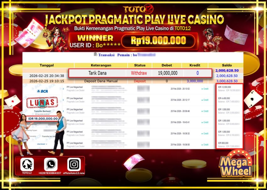 Selamat kepada Member Kami Bo**** Telah Jackpot dan berhasil mendapatkan kemenangan besar pada permainan JACKPOT PRAGMATICK PLAY LIVE GAME CASINO (MEGA WHEEL) Dengan Kemenangan Sebesar Rp.19.000.000–. Setelah mengisi Fomulir Withdraw dengan Kurang waktu 1-2 Menit Dana sudah kami Trasnfer kepada Pemilik Userid dan dana sudah dapat di cairkan oleh pemenang. Bukti Pembayaran yang TOTO12 berikan merupakan Bukti Pembayaran yang SAH / VALID yang langsung Di dapatkan melalui transaksi dari Bank yang di Tunju.